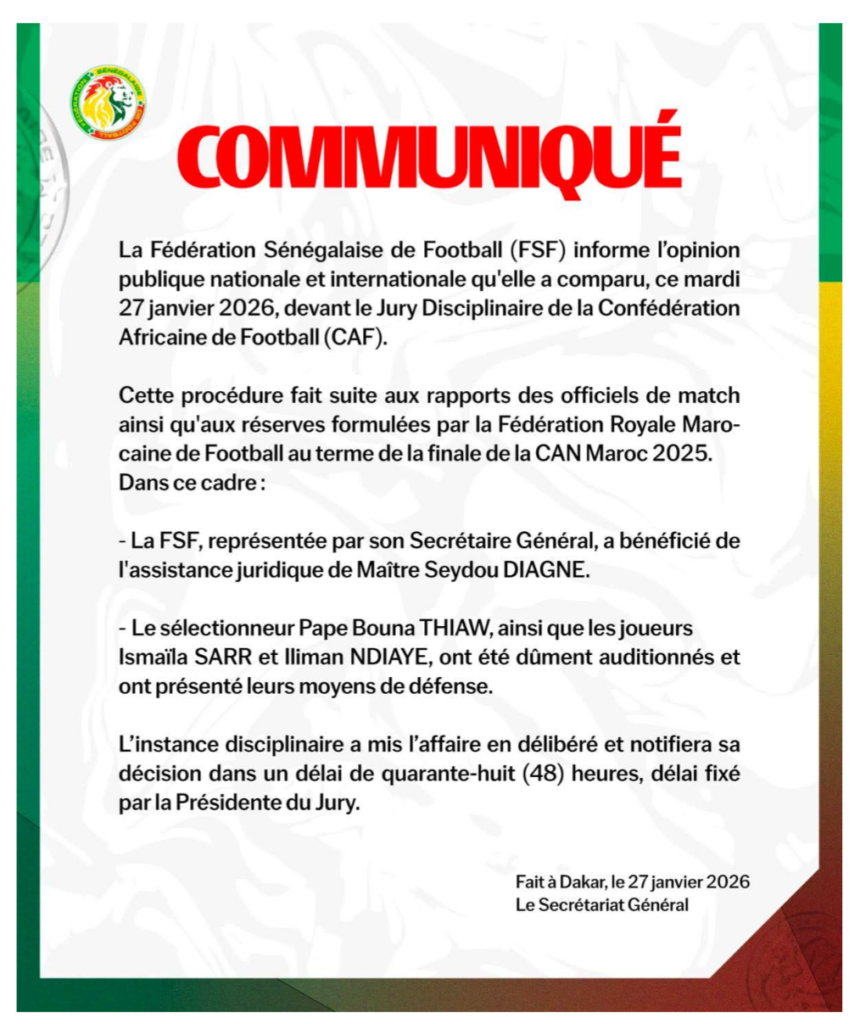 أصدر الاتحاد السنغالي لكرة القدم بيانًا رسميًا، كشف فيه تفاصيل مثوله أمام لجنة الانضباط التابعة للاتحاد الإفريقي لكرة القدم «كاف»، على خلفية التحقيقات الجارية بشأن أحداث المباراة النهائية لكأس أمم إفريقيا 2025 أمام منتخب المغرب.